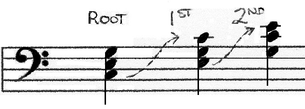 When the root is found on the bottom and the new two notes are seen as thirds, you are in the root position as found in the first chord. When you move the bottom note (called the root or “tonic”) up one octave and keep the other two notes in place, the chord is in the 1st inversion (see 2nd chord). Repeat the process again, with the “E” on top, the chord is now in the 2nd inversion (last chord).